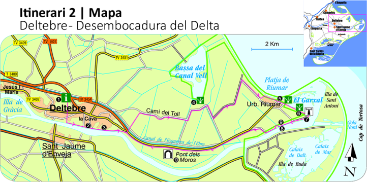 Comencem la ruta al centre del poble de Deltebre, des de l’Ecomuseu (on es troba el Centre d’Informació Turístic). En tot moment seguim les fàcils senyalitzacions de l’itinerari 2 (marcades en color rosa al mapa superior). Passem pel passeig fluvial de l’Ebre (durant 3 km) i agafem el trencant a mà esquerra de la rotonda cap al Camí del Toll, on gaudim d’un espectacular paisatge d’arrossars a banda i banda del camí, fins arribar a la urbanització de Riumar (km 15). Aquí trobem la platja, plena de dunes amb vegetació halòfila i molts mosquits, alerta!