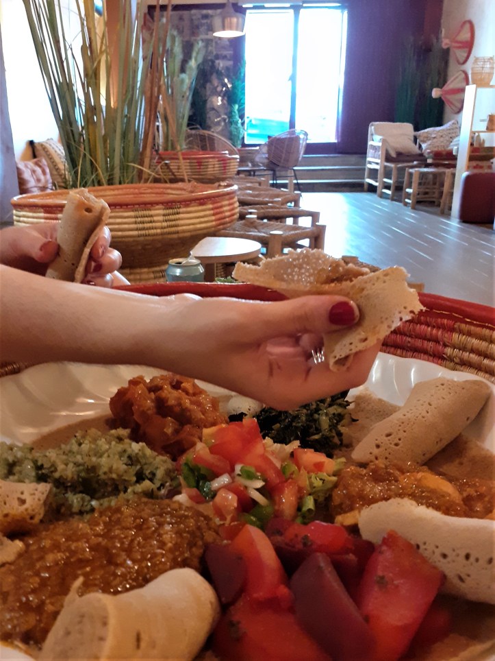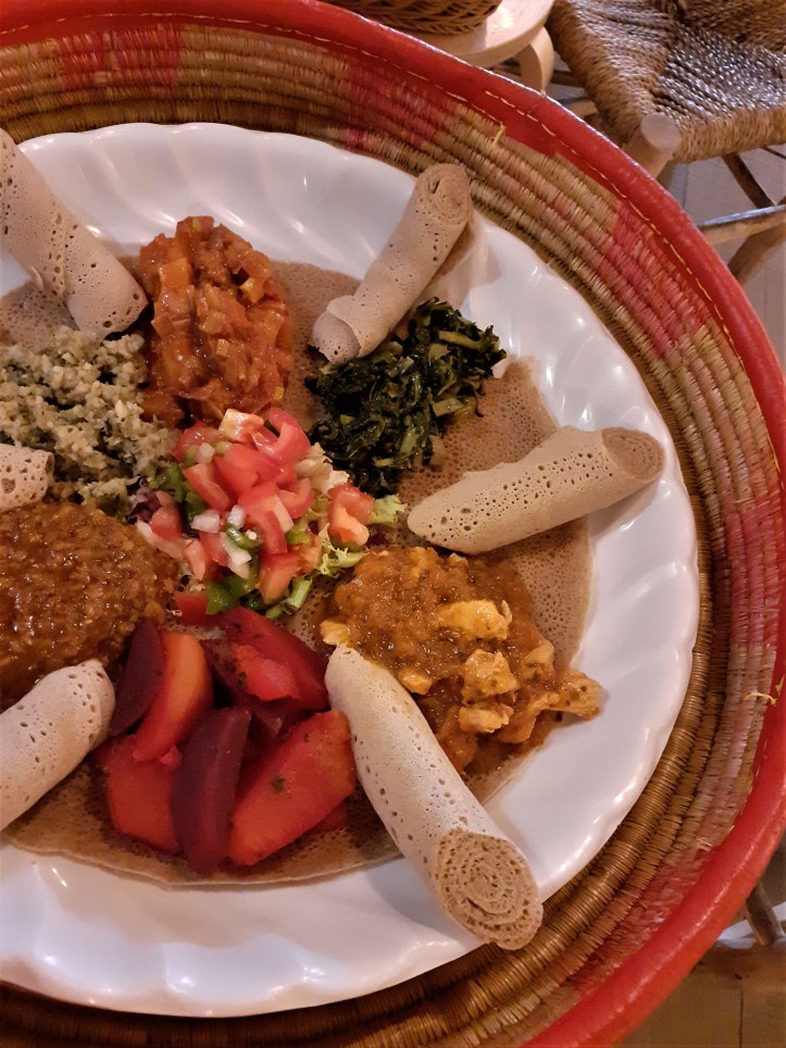 La carta és curta i les propostes estan basades en cuina vegana, doncs la costum etíop marca els dimecres i divendres de tot l’any com dies en què la població elabora els àpats amb absència de productes animals. Combinats de verdura i llegums ben especiats (amb el permís d’un parell d’estofats, de pollastre i vedella). I tot estèticament estès sobre la fina massa d’injera, per suposat. Plats versàtils i interactius que conviden a compartir-los, un cop servits sobre els mesob (aquestes acolorides i boniques “taules” artesanes en forma de campana). Amb les mans, sense por!